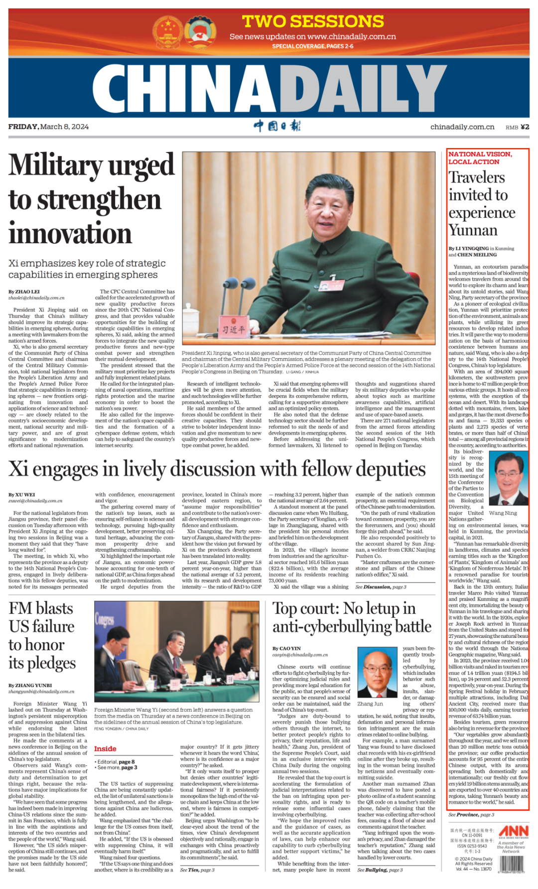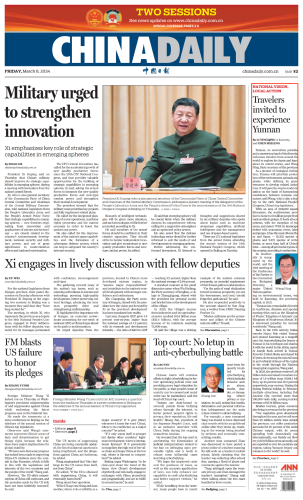 3月8日,《中国日报》头版刊发全国人大代表,云南省委书记、省人大常委会主任王宁专访文章,欢迎全球朋友来云南体验“有一种叫云南的生活”。