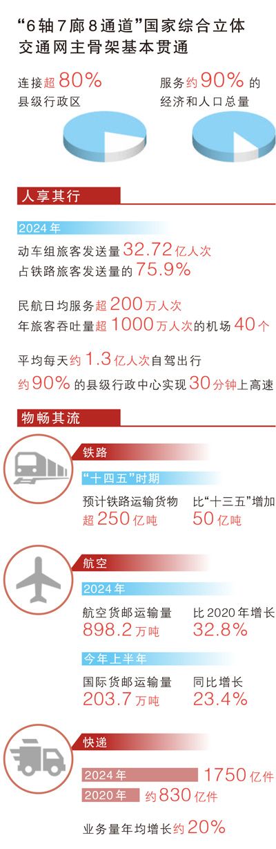 “大网络”基本形成。高铁营业里程达4.8万公里,占世界高铁总里程的70%以上;33条国家高速公路主线基本贯通,高速公路里程达19.1万公里;国家高等级航道达标70.4%,港口规模能力多年保持世界第一;航空服务覆盖92.6%的地级行政单元;邮政行业设立营业网点50多万处……我国已建成全球最大的高速铁路网、高速公路网和邮政快递网。