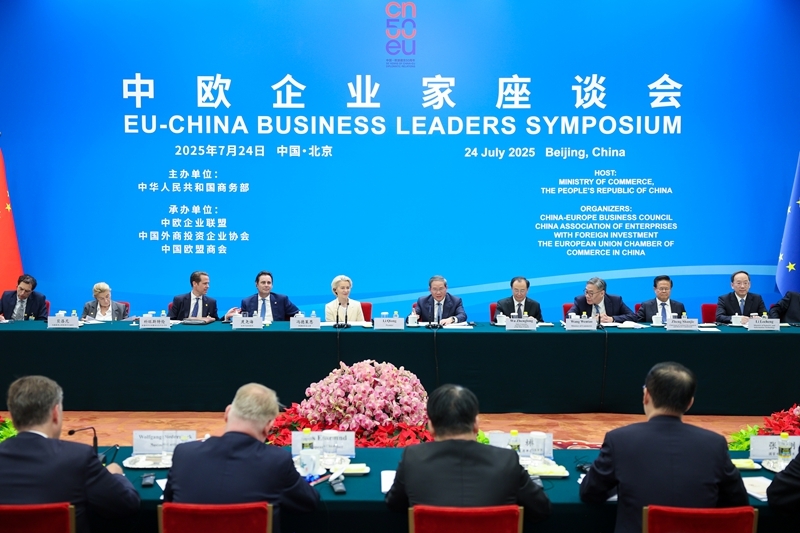 国务院总理李强7月24日下午在北京人民大会堂同欧盟委员会主席冯德莱恩共同出席中欧企业家座谈会。近60位中欧商会和企业负责人出席。